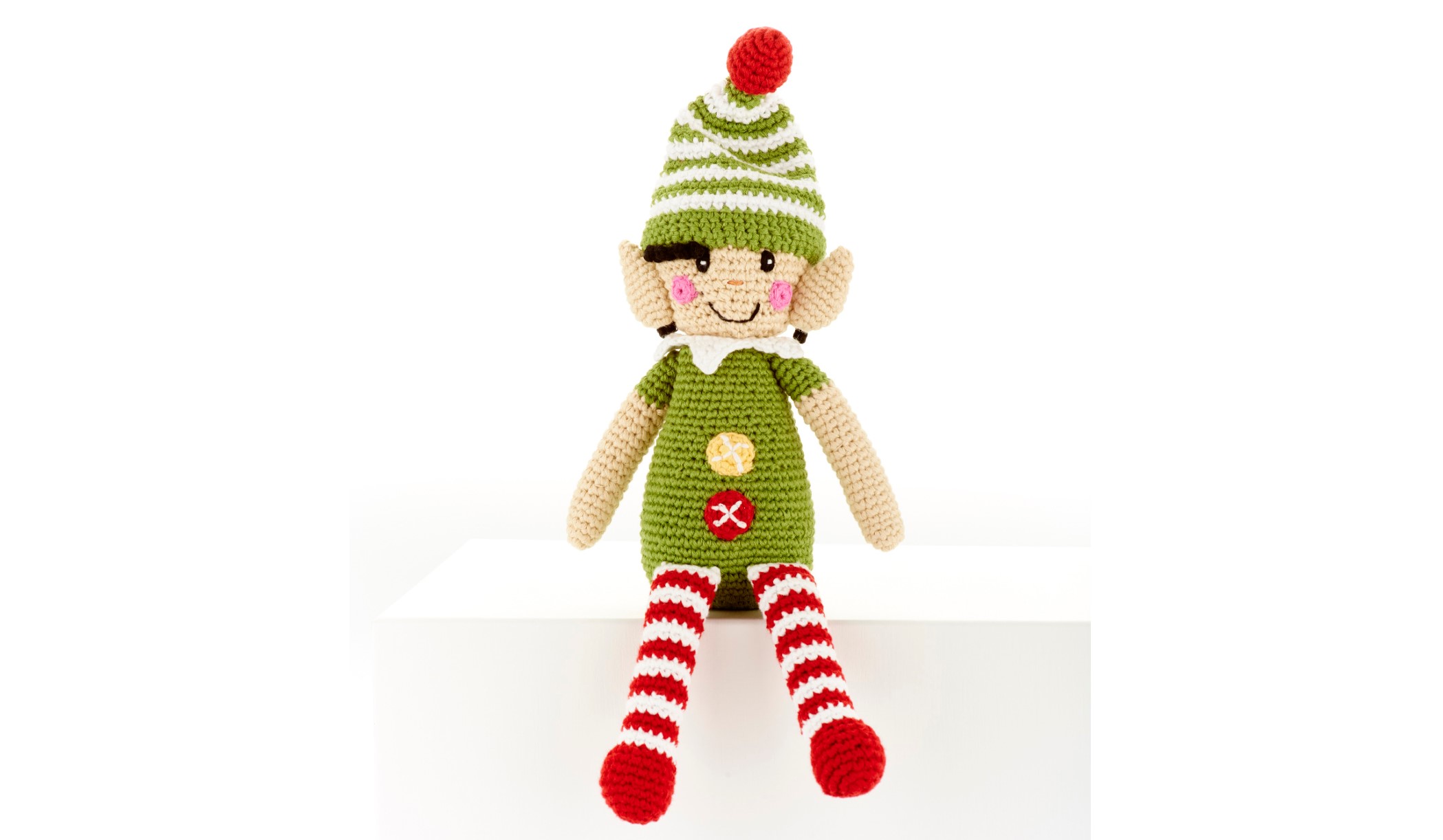 Our green, red and white elf is crocheted from cotton yarn and is suitable from birth and machine washable. Approximate dimensions: 36cm tall including hat by 17cm wide