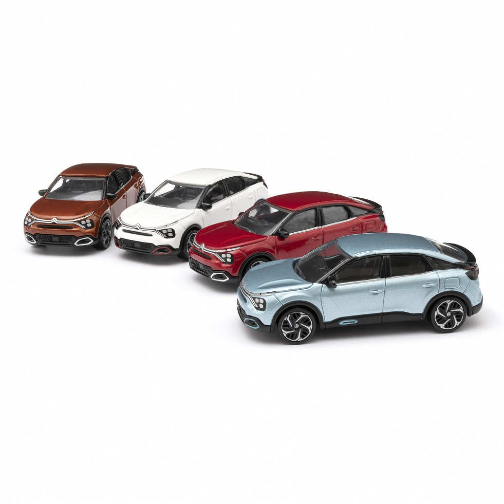 At 1/43 scale, two colours are available for New C4 and New ë-C4: Caramel Brown and Iceland Blue. In 1/64 scale, the New C4 miniature comes in four colours: Elixir Red, Polar White, Iceland Blue and Caramel Brown.