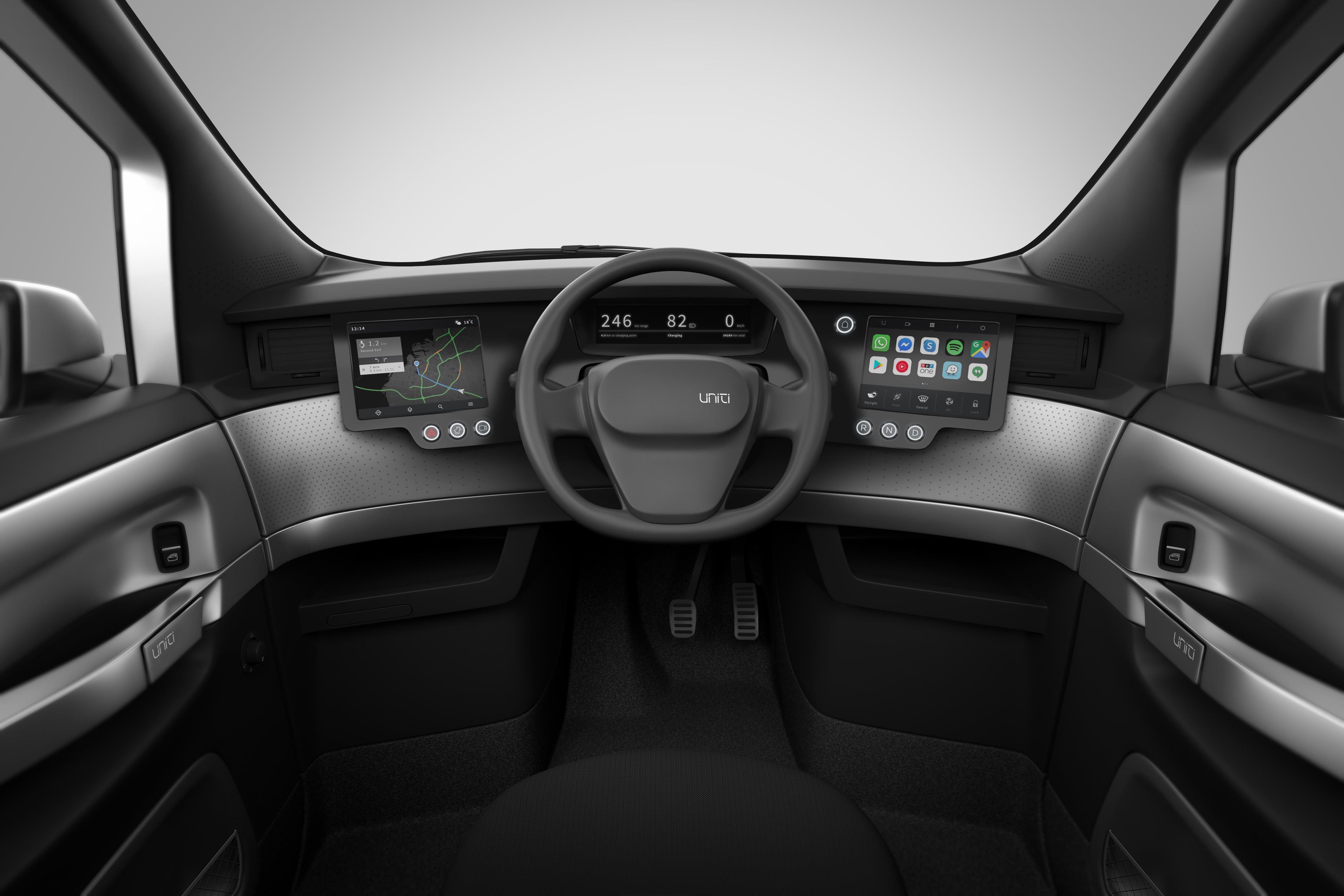 The Uniti One’s steering wheel is clad in smooth, moulded, soft touch material and carries an offset Uniti emblem within its pillule centre section.