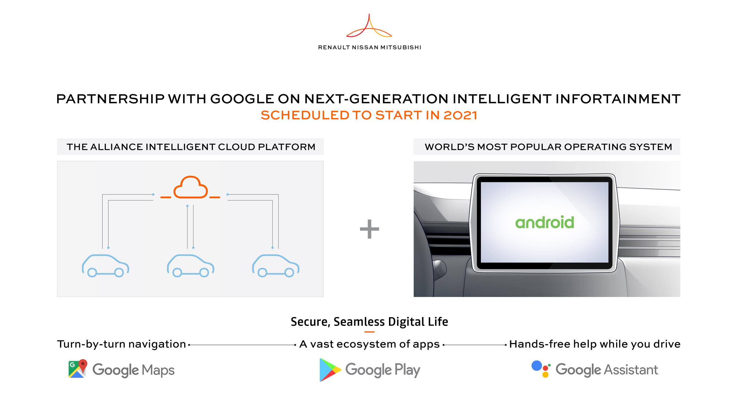 - World’s leading automotive Alliance signs a global multiyear agreement to partner with Google to equip Renault, Nissan and Mitsubishi vehicles with intelligent infotainment systems