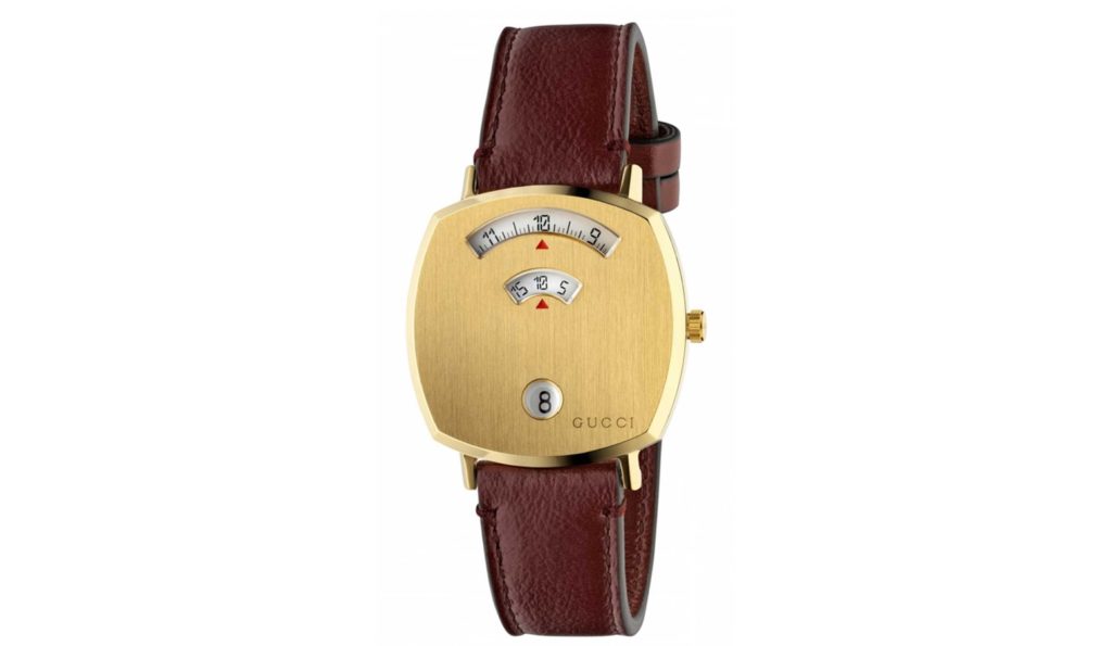 If you have a few more pounds to spend on updating your watch wardrobe, this Gucci Grip is an eyecatcher. A streamlined design, the watch takes its inspiration from the world of skateboarding, recalling the way the rider’s sneakers stick to the grip tape on a skateboard. The yellow gold PVD face has three disks to display the hour, minute and date completed with an alligator strap.