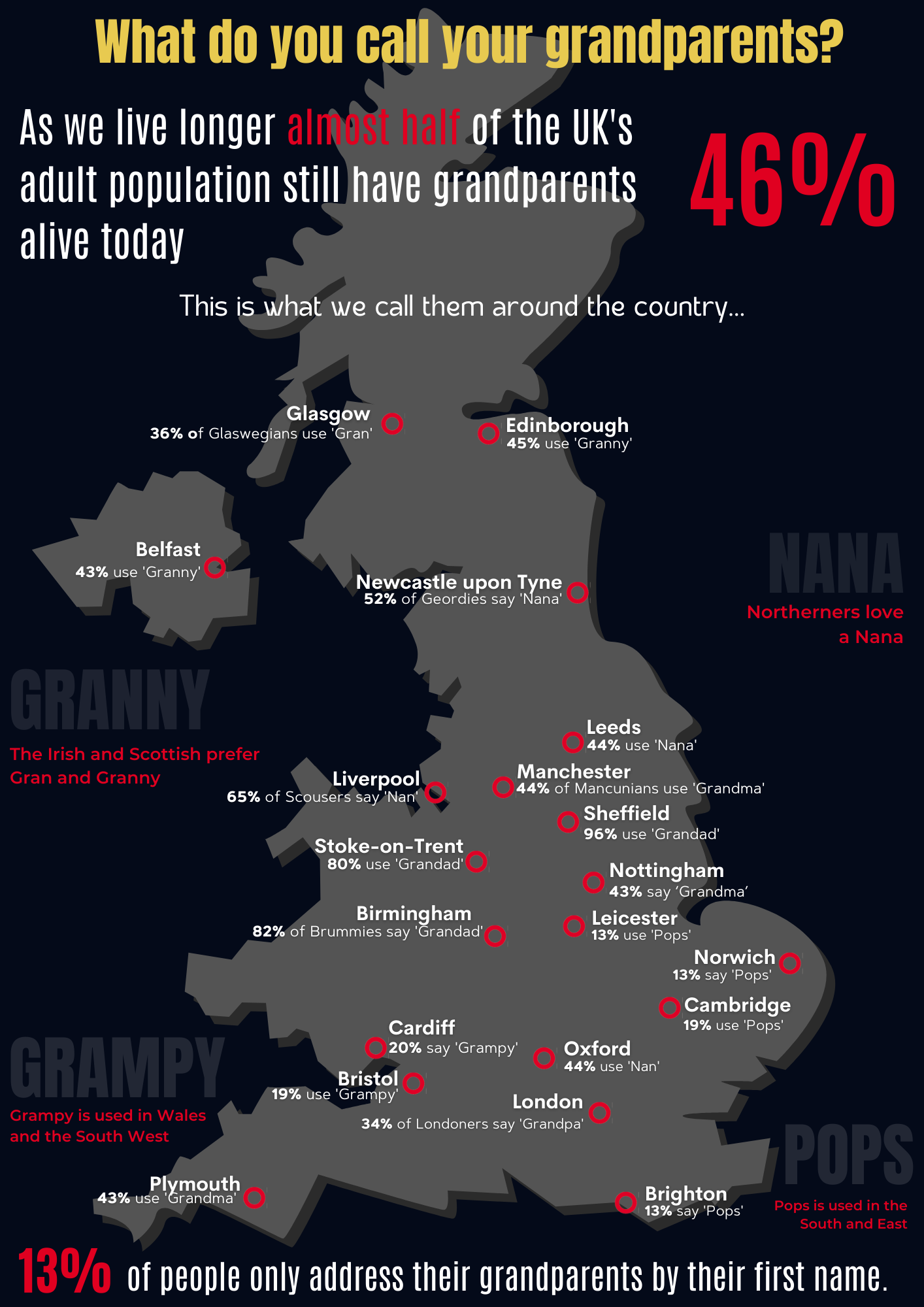 For grandfathers the most popular name nationwide by far is Grandad (68%) – with over two thirds of us using this name. It is favoured in the north with the majority of grandfathers in Sheffield alone (96%) being known as a Grandad. In contrast only one in five Brits opts to use Grandpa (22%).