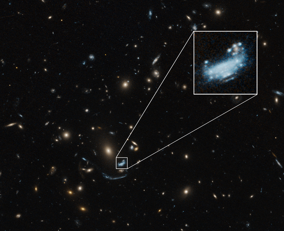 The phenomenon of gravitational lensing occurs when a huge amount of matter, such as a massive galaxy or cluster of galaxies, creates a gravitational field that distorts and magnifies the light from objects behind it, but in the same line of sight. The effect allows researchers to study the details of early galaxies too far away to be seen otherwise with even the most powerful space telescopes.